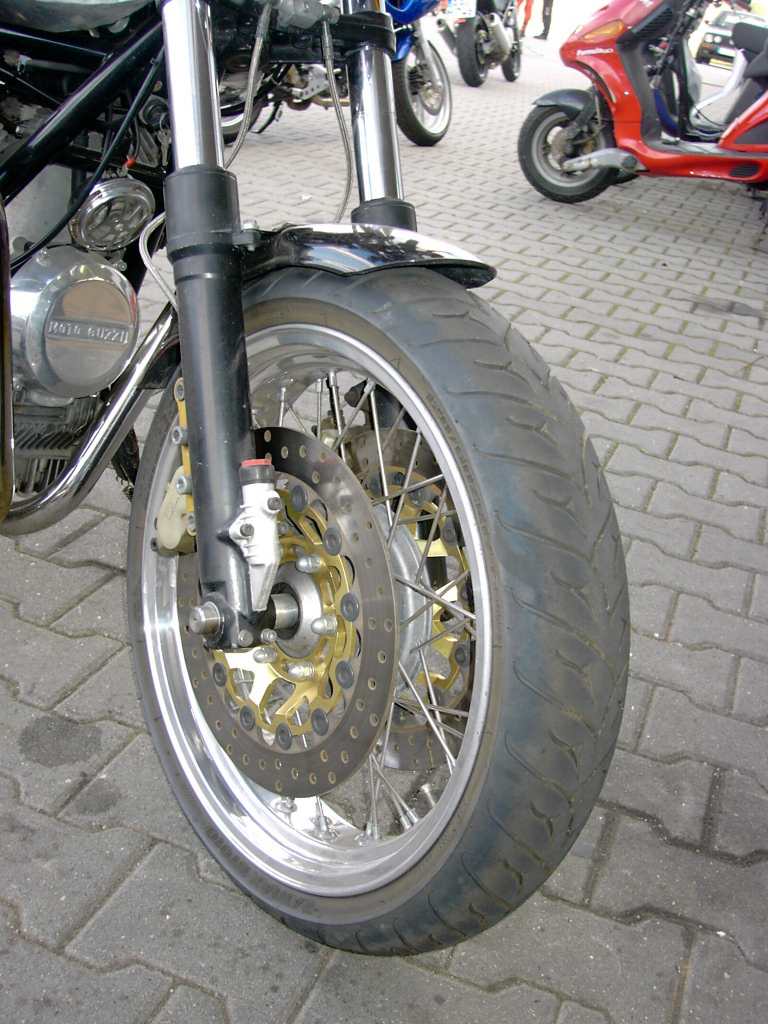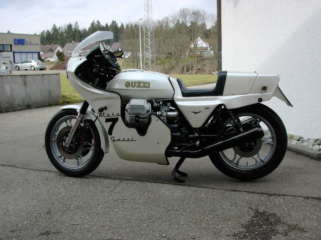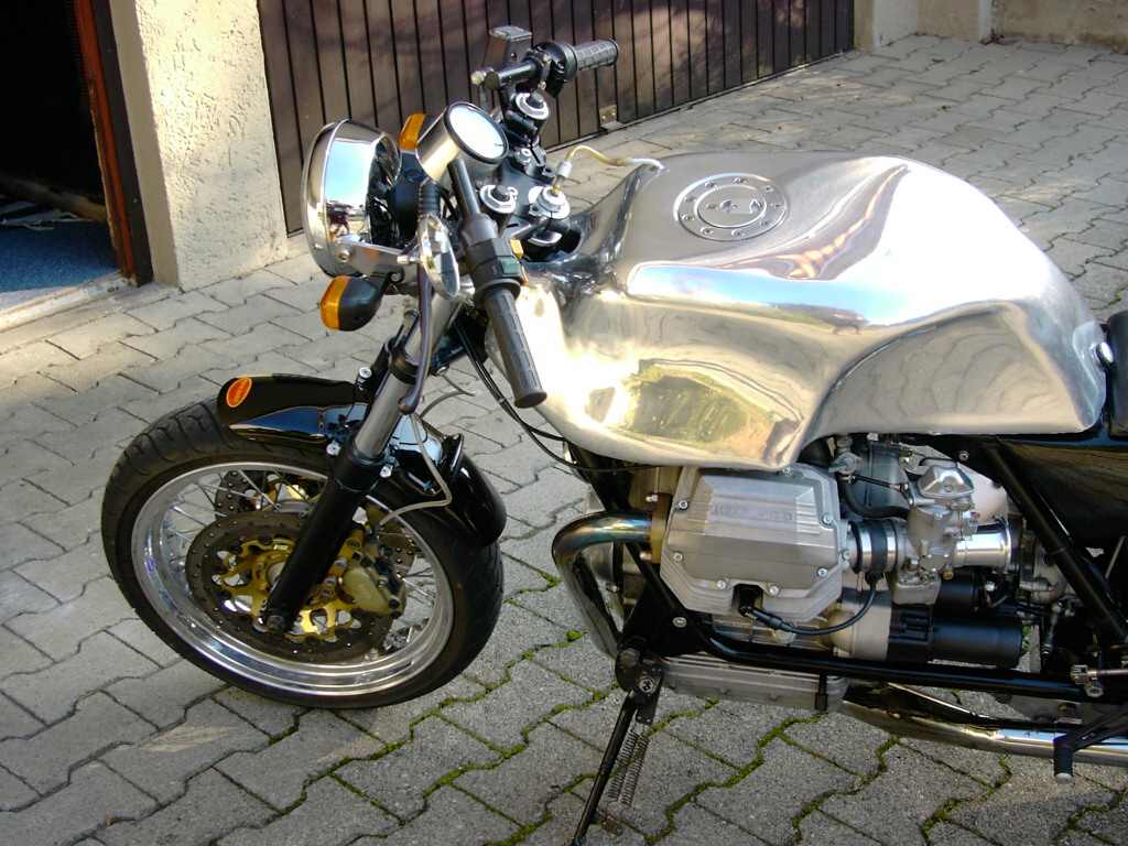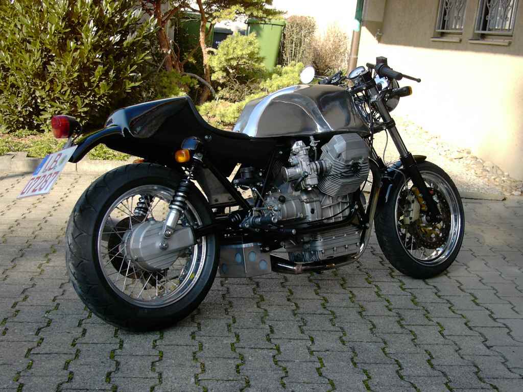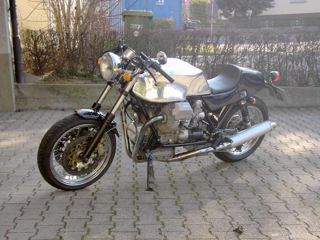 | | Hier die Technischen Daten zum Umbau von Axel Foley Hallo, also zu der DMB-Guzzi gibt es eigentlich nur soviel zu sagen, das es sich um eine 82iger DMB-Guzzi mit orig. 24tkm auf der Uhr handelt. Sie hat ab Werk 1000 Kubik, die Ago-Verkleidung und der Monohöcker waren damals Zubehör, welches nach Lust und Laune bzw. Geschmack individuell bestellt werden konnte. Sie hat 40iger Dellortos auch schon ab Werk, dazu noch ein geradverzahntes Renngetriebe. Die Endtöpfe sind von der LM 2 in Verbindung mit 40iger Krümmern. Sie ist 2te Hand. Und ansonsten hab ich sie original gelassen, bis auf den polierten Felgenrand bei den orig. Felgen. Die andere ist eine 83 iger LM3 mit ein paar Umbauten, wie : Moto-spezial Sitzbank 2in 1 Auspuffanlage von MAX Tarozzi-Fußrastenanlage Marzocchigabel M1R Brembo-4Kolben-Anlage ( schwimmend ) 27-Liter Alutank...... da kann ich nur noch hinzufügen, daß der Vorderbau von der Duc 851 ist, das Rahmenheck gekürzt wurde, hinten Stoßdämpfer von FAC drin sind, das Rahmendreieck leergeräumt wurde und die Batterie nach unten kam, die Schwinge geändert wurde und zwar wurde der Kardantunnel ausgefräst, damit die Akkront-Speichen der Größe :17*4,25 mit Reifen der Größe 160/60VR17 Platz hatten. Vorne sind es17*3,50 mir 120/60VR 17 Reifen. Der Bremssattel hinten wurde nach unten verlegt und durch eine Eigenbaustütze abgestützt.Stahl- flexleitungen von Frentubo sind dran. Die Schwungmasse wurde erleichtert und der Hubraum beträgt ebenfalls 1000ccm. Die Elektrik wurde auf ein Minimum reduziert. Die andere ist eine 83 iger LM3 mit ein paar Umbauten, wie : Moto-spezial Sitzbank 2in 1 Auspuffanlage von MAX Tarozzi-Fußrastenanlage Marzocchigabel M1R Brembo-4Kolben-Anlage ( schwimmend ) 27-Liter Alutank...... Ich hoffe die Bilder gefallen Dir Machs gut MfG Axel. | |