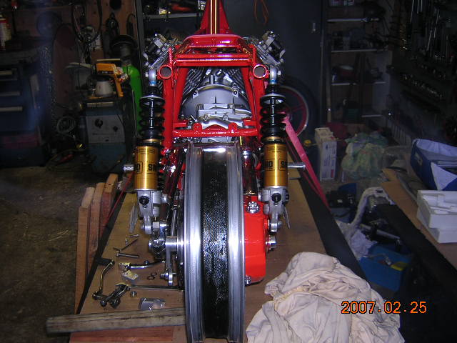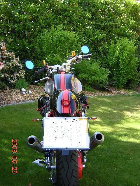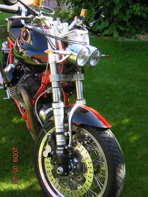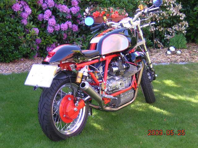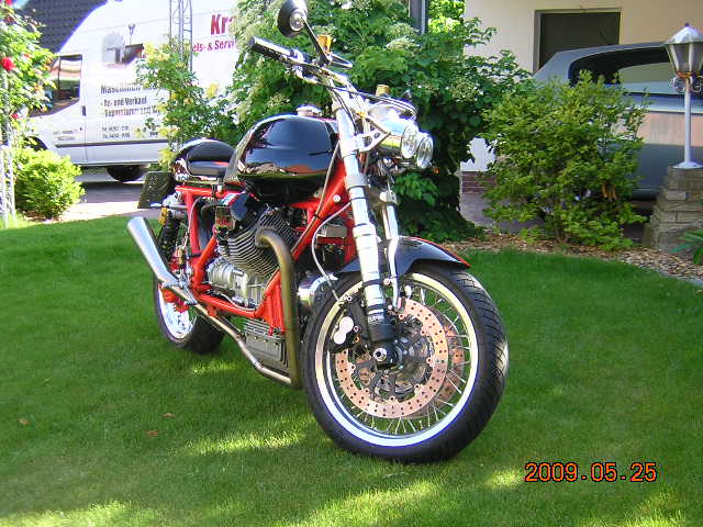 Hier die Technischen Daten zum Umbau von Bernd Krause: Hallo Karl Robert, ich heiße Bernd und bin ende 40 !!! Vor 20 Jahre habe ich das letzte Mal geschraubt, natürlich auch Guzzi und Ducati. Damals war man ein Exote, heute muß man sich schon was einfallen lassen. Diese Maschine ist also mein erstes Umbau-Objekt und nicht mein Letztes. Bin vor 2 Jahren in einen Laden bei mir um die Ecke und hab mir eine LM 4 gekauft, nur Rahmen mit Motor, den Rest hat er wieder bekommen. Dann fing ich an mich zu Informieren was heute alles so geht , es war gar nicht so einfach. Wenn man so lange raus ist, hat man vieles vergessen. Habe dann mit allen namhaften Firmen gesprochen und bin bei Jens Hoffmann, Fa. Dynotec, gelandet. Hier habe ich mir die ersten Teile gekauft und wurde auch gut beraten, der Mann ist ein absoluter Freak im positiven Sinne. Technische Daten: - Andere Nocke - Kurbelwelle fein gewuchtet - Doppelzündung incl. Kabelbaum - Motor komplett auseinander - Leichte Schwungscheibe mit Sachskupplung - Carillo Pleul - Kopf überarbeitet - Rahmenkopf geändert, steht steiler - Gabelbrücken von Weissmann mit Inletts - Hydraulische Kupplung - 2in 2 Auspuffanlage, klasse Handarbeit - Getriebe zerlegt und neu gelagert - Hinterradantrieb ebenfalls neu gelagert - Schwinge verchromt - Speichenräder 17 zoll - Bremsscheibe hinten 200 mm schwimmend - Doppelscheibe vorn 320 mm - WBO Tank - Neue Griffarmaturen - Und viele sonstige Kleinteile Es wurde alles auf ein kräftiges Drehmoment ausgelegt, von unten geht sie klasse. - Alles mit Tüv !!! Viele Grüsse Bernd Krause | |