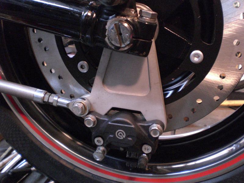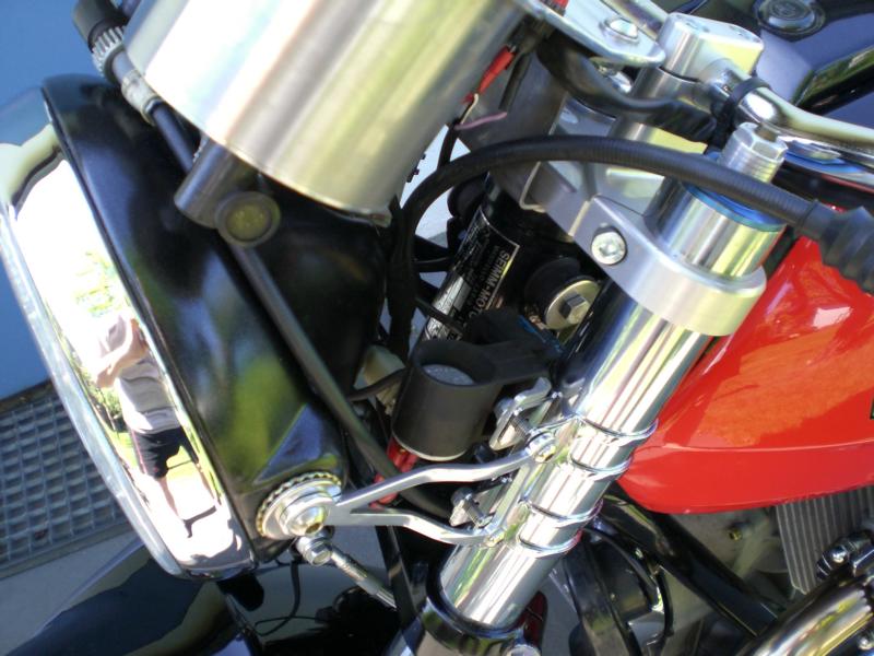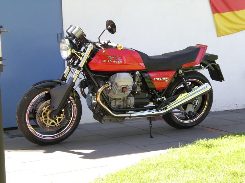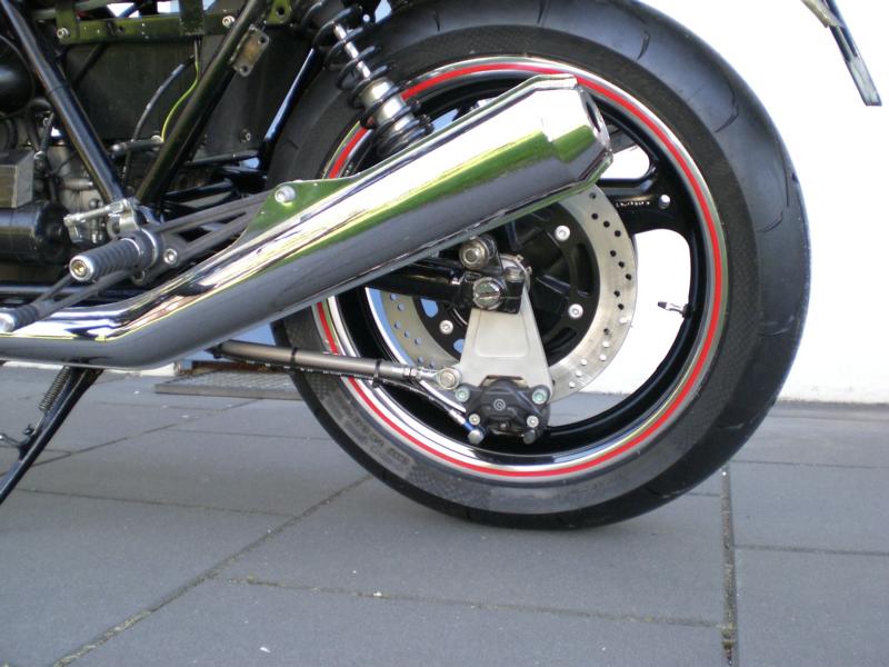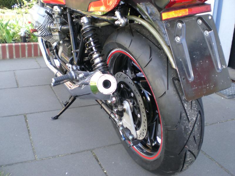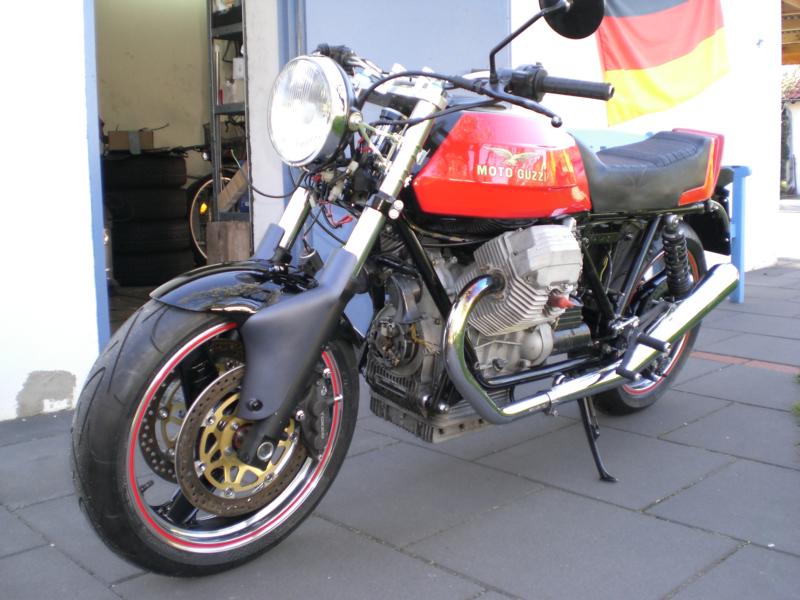 Moto Guzzi LM III Umbau von Harald Alt Hallo Karl Mein Umbau ist soweit fertig und fährt so wie ich mir das Vorgestellt habe, bis auf die Corbinsitzbank ist sie komplett. Angeregt durch das Guzziforum, wo Alex ( Axelino ) seine Guzzi auf Breitreifen gestellt hatte, beschloß ich das bei meiner LM III auch zu tun. Die Gute hatte ja schon ein LM IV Fahrwerk bekommen, mit gekürzter LM IV Gabel, Räder mit Bremse und LM IV Schwinge, das war auch alles Eingetragen. Mich reizte aber der Umbau auf 17 Zoll mit den entsprechenden Reifenbreiten, besonders die Gabel mit entsprechender Bremsanlage reizte mich, meine Wahl sollte auf eine ZX6R Telegabel mit 46er Standrohre, voll einstellbar, mit 6 Kolbenbremszangen fallen. Vorderrad mit 300er Bremsscheiben in 3,5X17 Zoll mit 120er Reifen. Hinten kam ein Daytona-Rad in 4,5X17 mit einen 160er Reifen rein, bis es soweit war mußte noch einiges getan werden: Schwinge mußte wegen des Spurversatzes nach rechts versetzt werden, sie sitzt jetzt 7mm weiter Rechts, dadurch mußte der Motor und das Getriebe mit nach rechts rücken damit der Antriebsstrang fluchtet, dazu mußte der Stirndeckel an der rechten Aufnahme um 7mm abgefräßt werden und an den Linken Motor- und Getriebeaufnahmen mußten entsprechend verlängert werden, was durch neu angefertigte Buchsen geschah. Die hintere Bremssattelhalterung mußte auch neu angefertigt werden, die Zugstrebe wurde eine von der Kawasaki ZXR 750 verwendet und modifiziert, der Seitenständer ist von dem selben Modell und passt ganz hervorragend, wie dafür gemacht und ist für kleines Geld im Internet zu bekommen. Das Lenkrohr drehte mir ein Bekannter und ich konnte die Guzzi endlich auf die Räder stellen. Da ich ja die Orginale Linie mit der Sitzbank erhalten wollte mußte die Sitzbankhalterung umgebaut werden, so das der 160er Reifen beim Einfedern freie bahn hat, statt innen an den Ausfallenden verschraubt, habe ich die Befestigung mit Gelenkköpfen nach außen verlegt, so ist die Sitzbank weiterhin klappbar. Technische Daten Motor LM III mit 950ccm HTM Drehmomentnockenwelle 40er Edelstahlkrümmer von Wulf Peppmöller LM 1+2 Lafranconi Riservato Auspuffanlage Tarrozi Rastenanlage Schwinge LM IV Gabel ZX6R mit 6Kolbenbremszangen von Tokico aus Bj 99 Untere Gabelbrücke mit geänderten Steuerrohr Obere Gabelbrücke von ABM mit Rohrlenkeraufnahme Stahlflexbremsleitungen Bleigelbatterie mit 13 Ah Elektrik Eigenbau Seitenständer ZXR 750 Zugstrebe ZXR 750 Schwimmende Bremssattelaufnahme Eigenbau Gruß Harry |