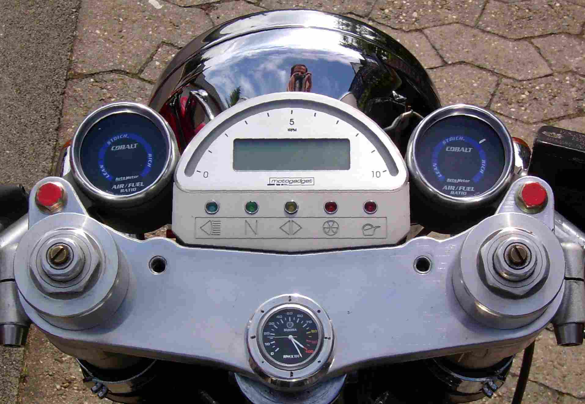| | Hier die Technischen Daten zum Umbau von Ralf Dupont: Le Mans 1000 Caferacer - Bohrung: 92 x 78 - Brennraumbearbeitung: Kolbendom, Köpfe geräumt, Zylinder abgelängt, Quetschkante 0.8, Kompression 10.5:1 - Dynotec-Nocke 7906 mit härteren Ventilfedern - Stirnradsatz und angepaßte Steuerzeiten - Kurbelwelle gewuchtet - Doppelzündung mit Piranha-Zündung - 2 x Dellorto PHM36 mit langen Trichtern - Große Ölwanne mit außenliegendem Ölfilter - Transconti-Einscheiben-Kupplung - LeMans4-Schwinge - Akront-Speichenräder 4.5x17 mit 160 60 ZR17 und 3.25 mit 120 60 ZR 17 - Vorderbau von GSX-R 1100, inkl.Nissin Bremsanlage, Brücken und Steuerkopflager - Moto-Spezial Fußrastenanlage mit Bremsanlage hinten - Rahmen silber pulverbeschichtet - Minimalkabelbaum mit offenem Rahmendreick - Batterie, waagerecht in VA-Kasten unter Getriebe - Motoscope Cockpitinstrument mit digitalem Drehzahlmesser und induktivem Geschwindigkeitsgeber in Eigenbau AL-Konsole mit LED - 2 x Gauges-Lambdamesserinstrumente und 2 x Lambdasonden - WBO-Alutank, lange Ausführung - Eigenbau Alu-Heck mit Unterbau und versenktem LED-Rücklicht und gekürztem Rahmenheck - Gewicht: 230 kg fahrbereit - Leistung laut Prüfstand: 85PS, 103Nm nach EG-Norm Gruß Ralf | |