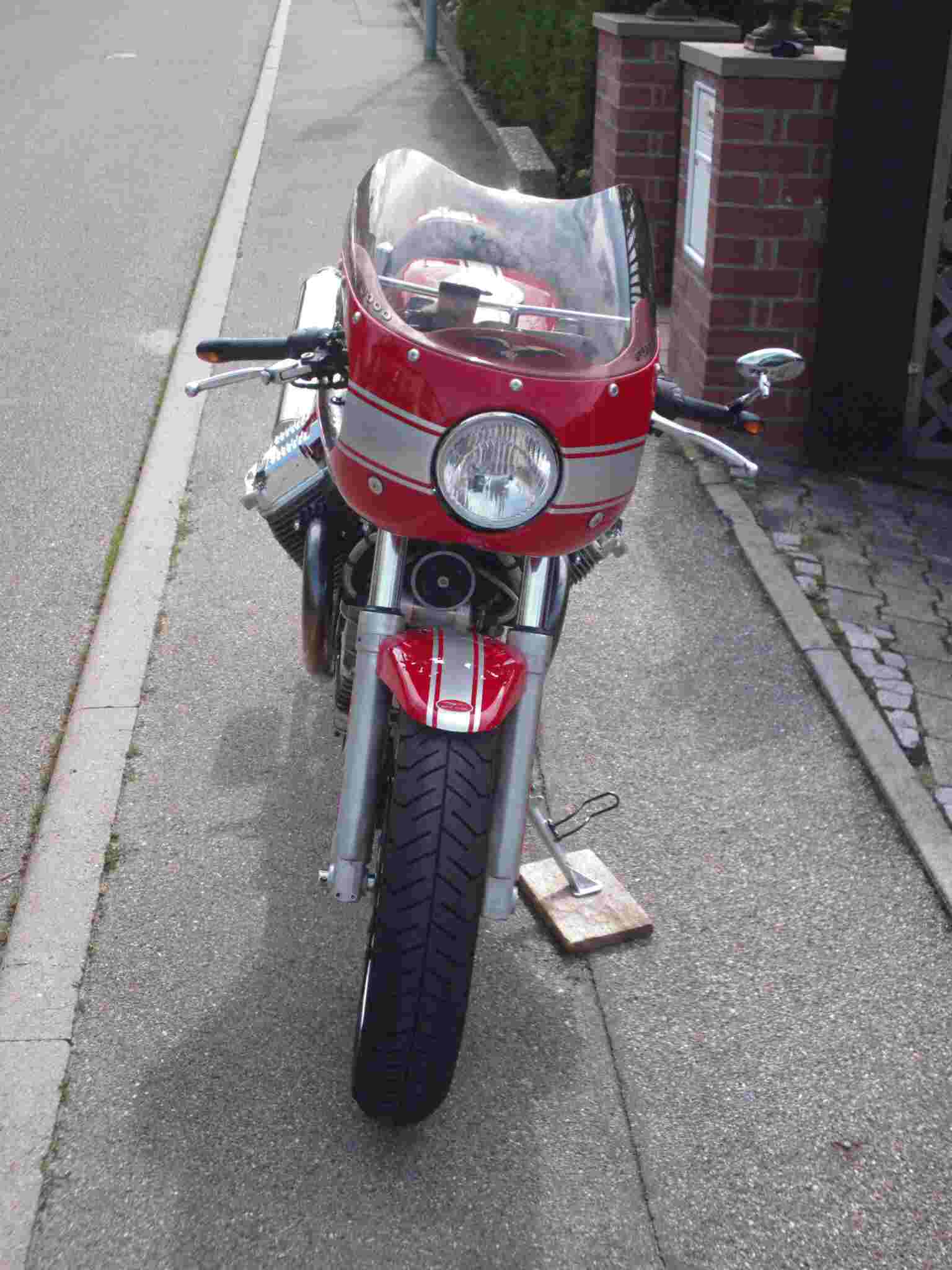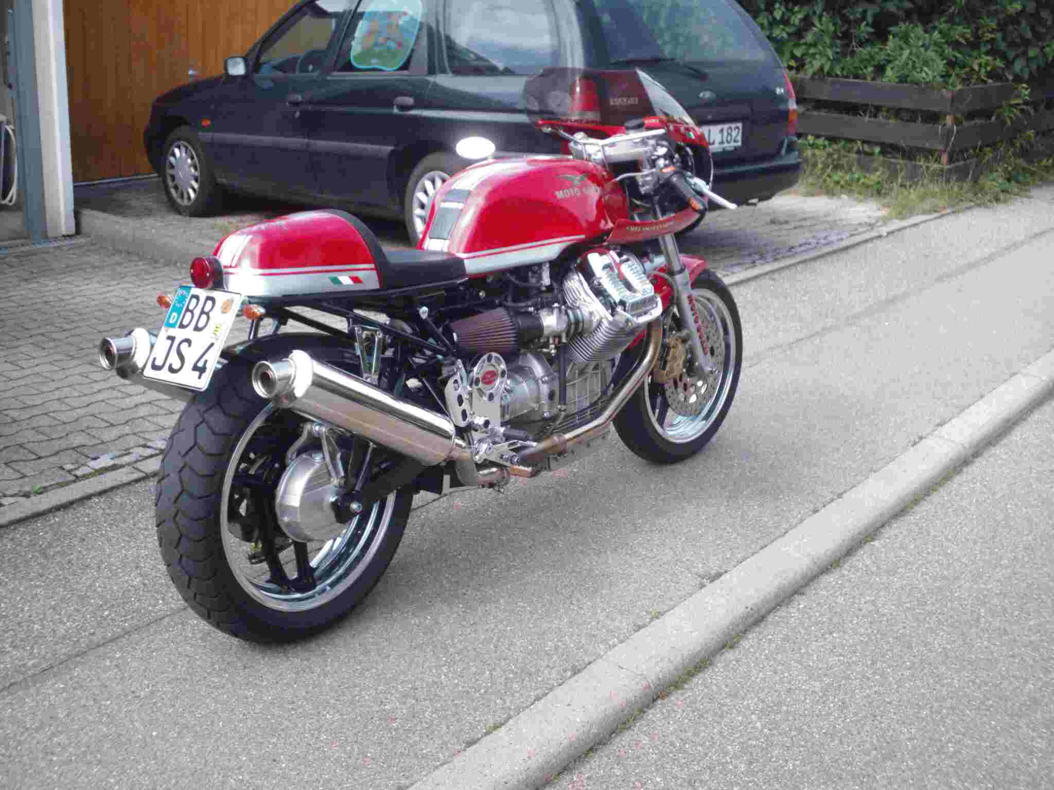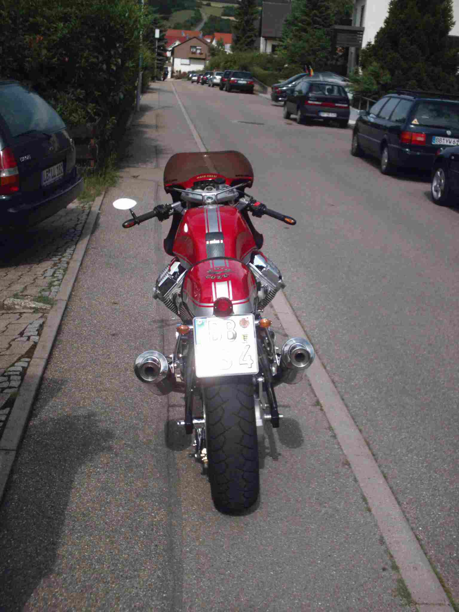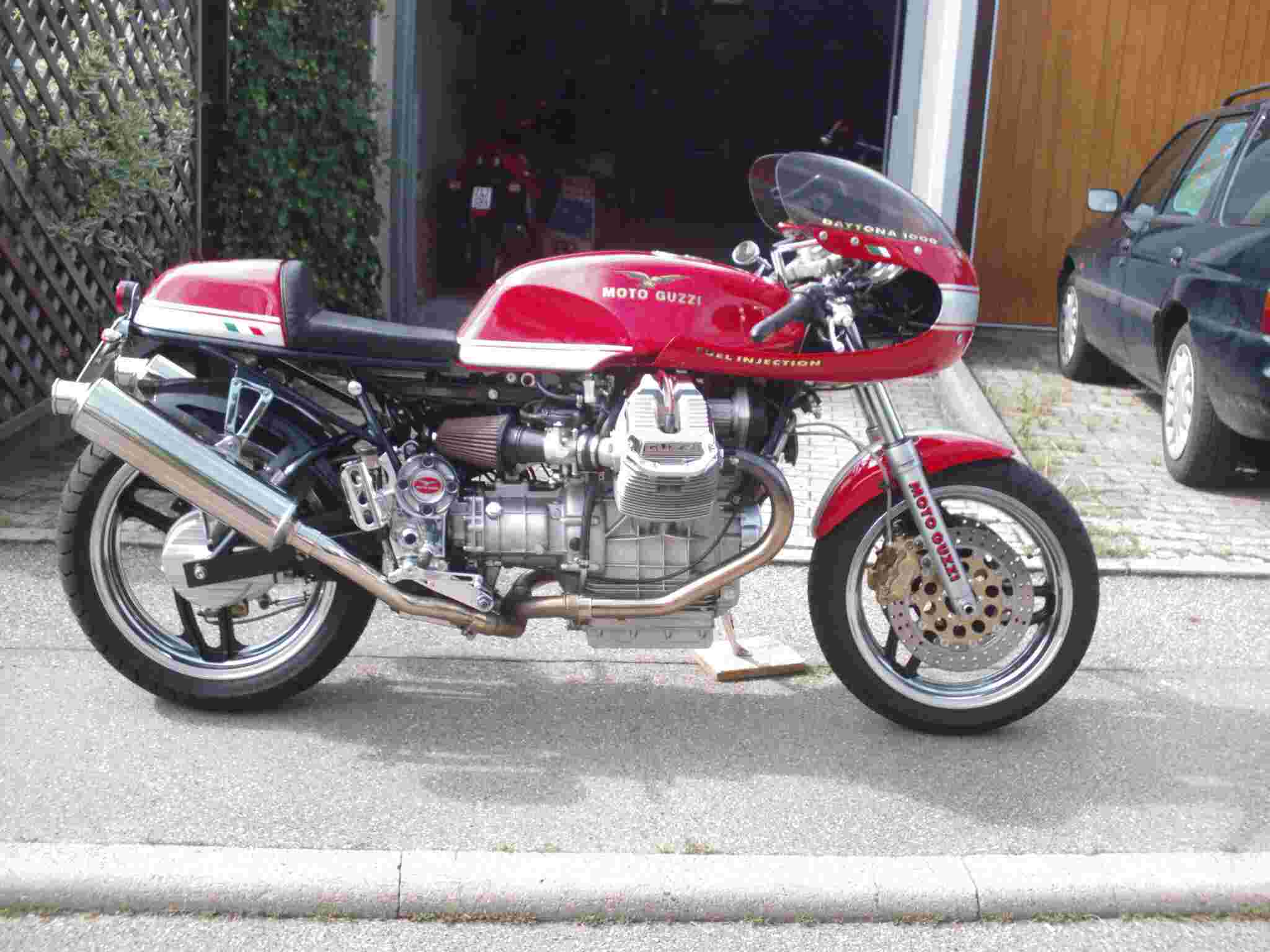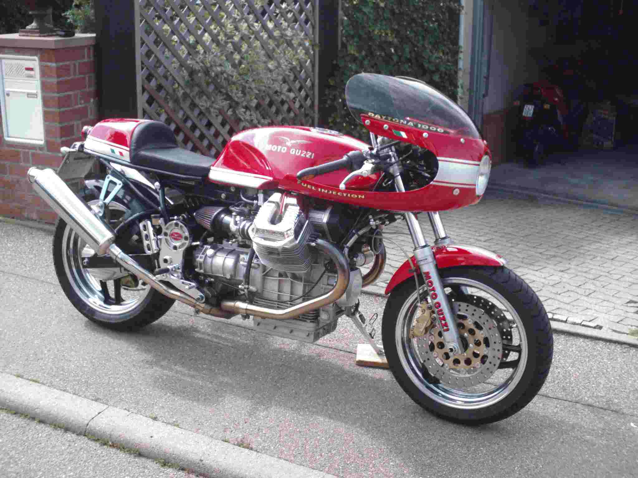 Hier die Technischen Daten zum Umbau von Julius Bott: Daytona - Guzzi Hallo!! Hier noch einige Technisch Daten von Meiner Daytona. BJ - 1992 (Erstserie) CMM- 992 PS - 93 KM - 15000 Die Daytona wurde technisch von Fa. DÄS-Mototec komplett überholt. Zylinderköpfe wurden optimiert. Ölpumpe wurde Nadelgelagert und vieles mehr. Da mir die Lackierung von der Duc-Köwe immer so gefallen hat habe ich die Guzzi so optisch lackiern lassen. Wie Du sicher schon gesehen hast sind die Felgen Poliert worden und innen schwarz lackiert. So Karl, ich hoffe das Du mit den Daten was anfangen kannst. Viele Grüße und allzeit gute Fahrt Julius | |