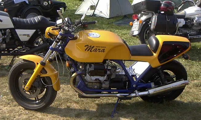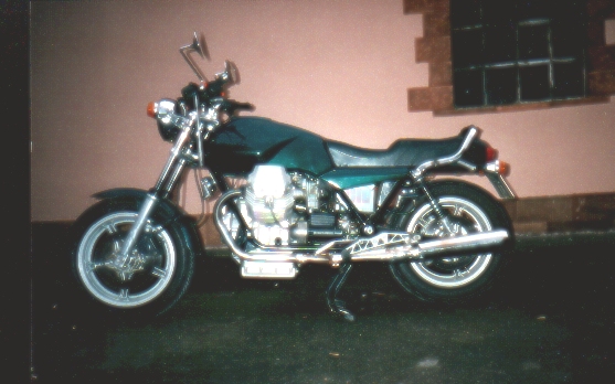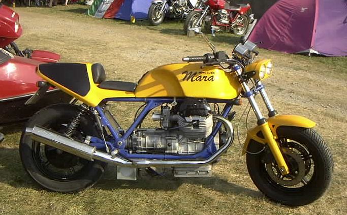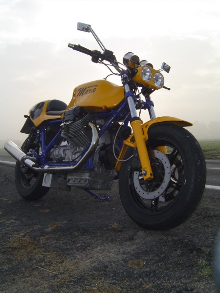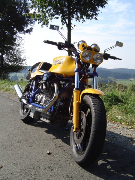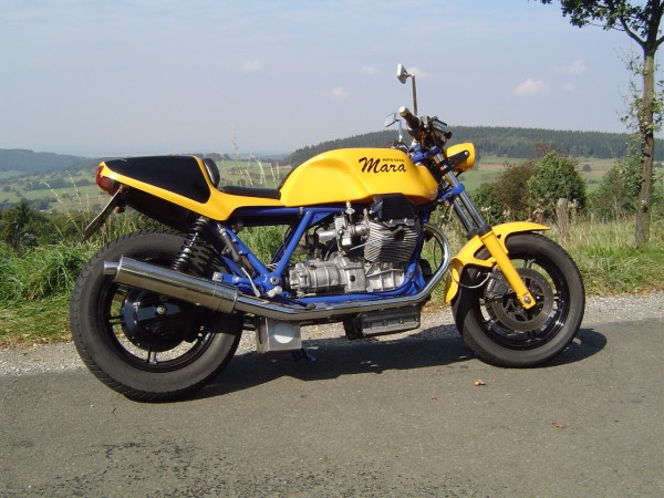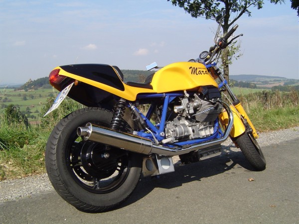 Hier die Technischen Daten zum Umbau von Maike: Mara - Guzzi Hallo!! Eigentlich bin ich ja nicht der Meinung, daß meine T5 in die Reihe dieser edlen Guzzi Umbauten gehört. Aber wenn´s denn sein soll....... Ich habe sie 1999 im original Zustand gekauft. Hat mir ja gar nicht gefallen, abgesehen vom Motor. Aber ich hatte schon so meine Vorstellungen........ Also erst mal alles auseinander. -An Motor, Getriebe, Fahrwerk usw. wurde nichts geändert - Die Elektik wurde komplett erneuert und unter der Sitzbank konzentriert. - Die Batterie nach unten unter den Rahmen verlegt. - Piranha Zündung eingebaut. -Aprilia Doppelscheinwerfer (leider nur 35W) -Stahlflex Bremsleitungen -Das Integral-Bremssystem getrennt -Offenes Rahmendreieck -Offene Ansaugtrichter mit Anschluss Motorentlüftung -Fußrastenanlage Agostini für LM4 -WBO Alutank lang -Däs BOT Einmann- Höckersitzbank -BSM Auspuffanlage -Instrumentenkonsole, Gehäuse für Tacho-Drehzahmesser und Batteriekasten Eigenbau -Ein Haufen Kleinkram noch...... -Das war´s eigentlich.......... noch´n bisschen Farbe......... fertig Ach ja, als die Felgen in der Sandstrahlkammer standen, wurden sie von einem Gabelstaplerfahrer übersehen............. also noch zwei neue Felgen ! Gruß Maike | |